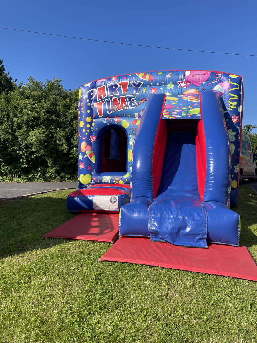Our Party time Theme bouncy castle & Slide Combi is great addition to any party &is one of our most popular products in our fleet! with its eye catching digitally printed artwork with balloons & streamers which is suitable for both boys and girls from the ages of 5 years old upto teenagers, This Bouncy castle combi in comes with a large Blue & Red bouncy platform Bed and high enclosed walls with netted windows.