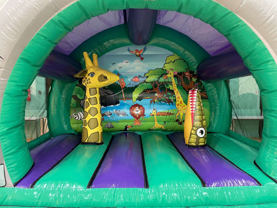 Our Jungle themed bouncy castle Hire is a hugely popular choice for both boys & girls, featuring incredible artwork of colourful animals that you will find all around the world paired with vibrant colours and two realistic 3D Animal Bish N Bash pillows for even more fun! This 3d jungle themed bouncy castle hire also features Netted walls which give spectators more viewing areas to keep an eye on younger users.