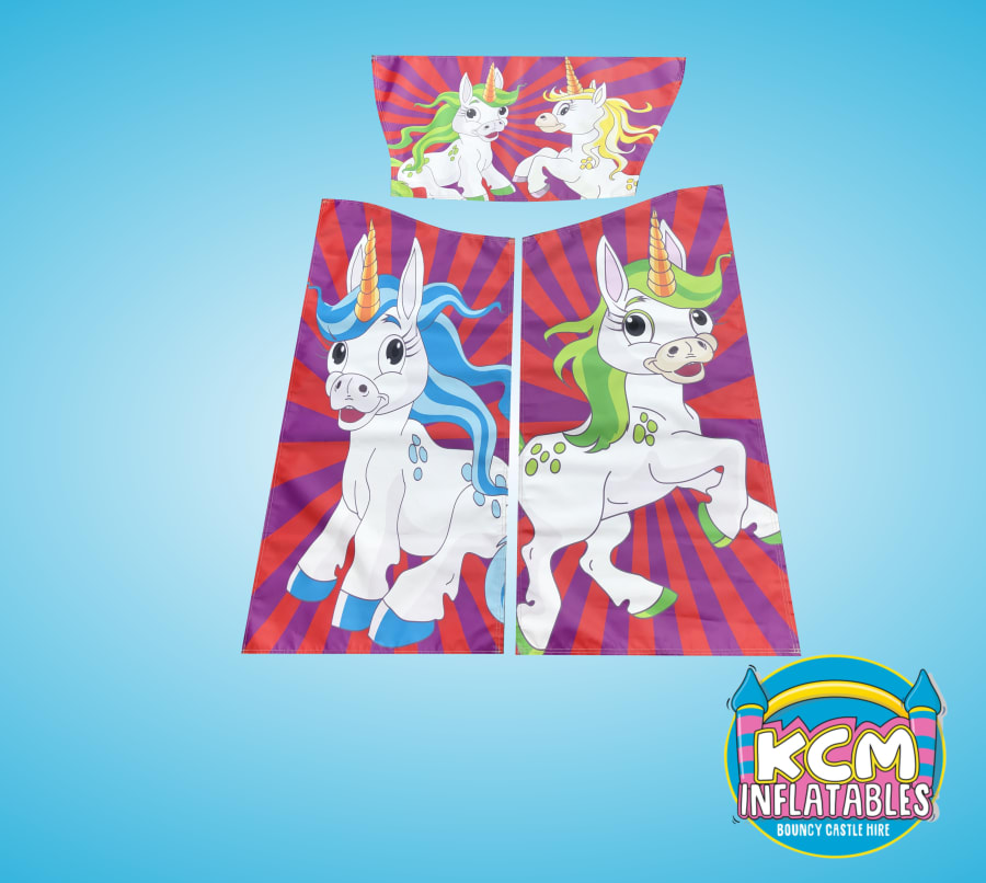 This 11x15ft pink & blue unicorn bouncy castle hire can can keep a party of up to 20-30 children entertained however we do advise our customers to not exceed the recommended capacity at a time which is clearly marked on all of our inflatables to help with supervision and prevent injury. The bouncy castle is fully tested to meet strict Health and safety guidelines. All of our hires feature a large inflatable safety mat at the front for guest to remove/put on their shoes. The inflatable also comes with a built in rain cover to protect the children from either the sun or rain depending on the time of year whilst letting plenty of light in for indoor hires.