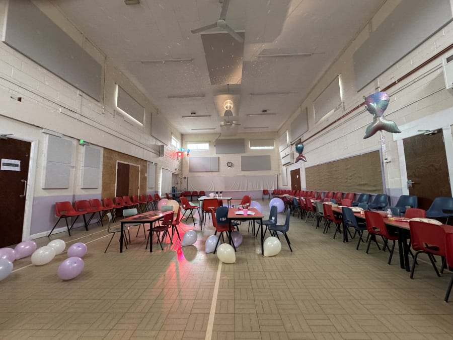 The indoor venue is also used as a small sports hall for Badminton classes etc, it also includes a small disco light set up in the corner of the room as well as featuring a sparkling night sky LED ceiling. The village hall also offers a good selection of tables and chairs as well as use of its newly refurbished Kitchen Area and serving Hatch, the main hall can accommodate upto 100 guests.